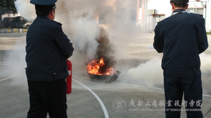 負責學院安全工作后勤管理處(保衛(wèi)處)副處長梁昆同志首先介紹了此次演練的目的在于根據(jù)學院《關(guān)于印發(fā)〈廣西工商職業(yè)技術(shù)學院安全大檢查工作方案〉的通知》精神,為廣大師生員工創(chuàng)造一個安全、祥和的工作、生活環(huán)境,迎接2017年新年。接著由物業(yè)公司負責人給大家講解了預防火災(zāi)的相關(guān)知識,在實際操作中,點燃了堆放在操場的可燃物,由操作人提著滅火器,將白色的粉末噴向大火,頓時操場上升騰起濃濃的白色煙霧,真實模擬了火災(zāi)現(xiàn)場,場面很壯觀。最后參加演練的人員在現(xiàn)場嘗試干粉滅火器的使用。