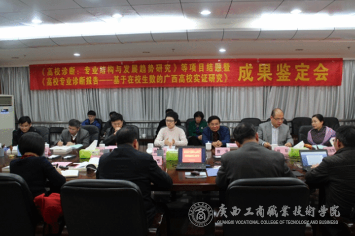 ??????? 據(jù)介紹,《高校診斷:專業(yè)結(jié)構(gòu)與發(fā)展趨勢研究》項(xiàng)目,是廣西壯族自治區(qū)教育廳以桂教科研〔2014〕8號文件下達(dá)的由我院院長陳杰教授為負(fù)責(zé)人承擔(dān)的委托課題?!痘诜謱I(yè)在校生數(shù)的廣西高等學(xué)校專業(yè)診斷分析》項(xiàng)目組是在自治區(qū)教育廳李向紅處長及陳杰院長的帶領(lǐng)下,由自治區(qū)教育廳規(guī)劃處干部和廣西工商職院科研人員23人共同組成。該項(xiàng)目以廣西工商職業(yè)技術(shù)學(xué)院職業(yè)教育研究所為研究基地,歷經(jīng)3年,經(jīng)團(tuán)隊(duì)成員反反復(fù)復(fù)無數(shù)次集中推敲、分散論證,再集中研討,才最后確定研究方案。在研究過程中,項(xiàng)目組成員通過參照國家相關(guān)法規(guī)文件,制定了若干高校評價(jià)工具和模型,先后設(shè)計(jì)了12個(gè)課題標(biāo)準(zhǔn)表。在制訂12個(gè)《標(biāo)準(zhǔn)表》的基礎(chǔ)上,項(xiàng)目組經(jīng)反復(fù)研討,設(shè)計(jì)了系列《數(shù)據(jù)表》,再將廣西全區(qū)高校數(shù)據(jù)倒入表格,進(jìn)行對比分析,不斷修改、完善,形成了《診斷報(bào)告模板》。