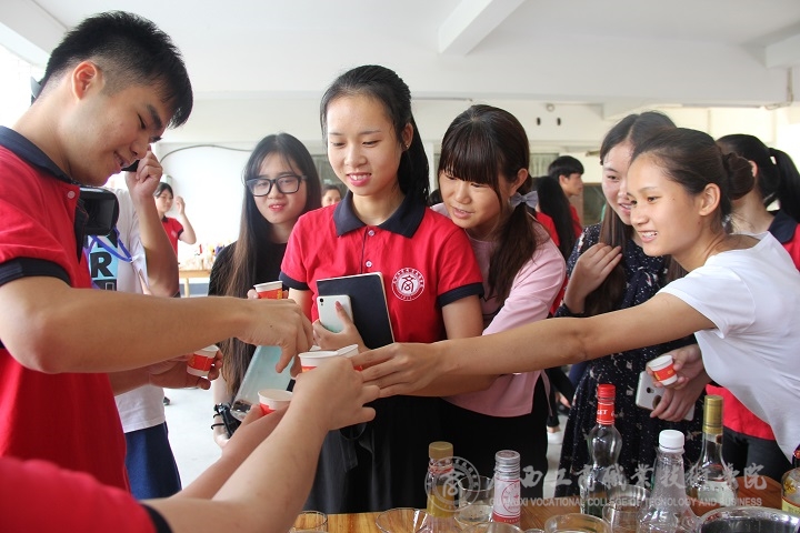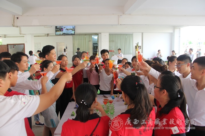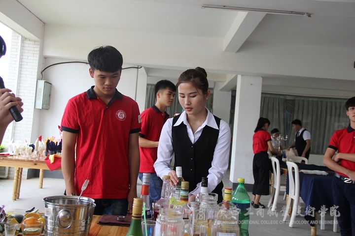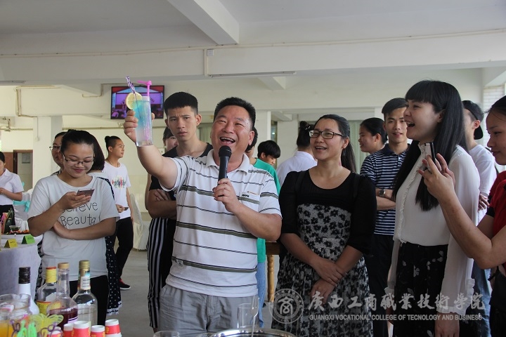 展演到了高潮環(huán)節(jié)。主持人邀請了兩位酒店專業(yè)的學(xué)生進(jìn)行現(xiàn)場調(diào)酒大比拼,令聲一響,他們便開始忙碌起來,熟練的動(dòng)作,從容而不失風(fēng)采。短短的幾分鐘,他們便調(diào)出了自己心儀的酒來,還主動(dòng)邀請現(xiàn)場觀眾來品嘗。觀眾們喜笑顏開,喝了一杯,還想再來一杯!展演中還邀請了兩位非酒店專業(yè)的學(xué)生現(xiàn)場調(diào)酒,專業(yè)調(diào)酒人員手把手教學(xué),耐心地指導(dǎo)著。