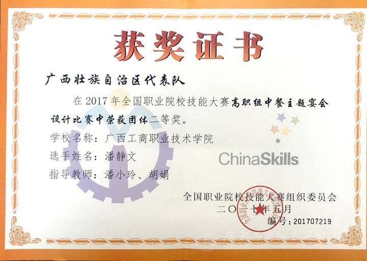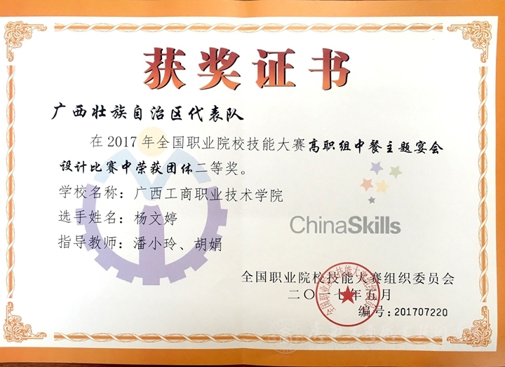 2017年5月18日-5月21日,2017年全國職業(yè)院校技能大賽(高職組)中餐主題宴會設計賽項在青島酒店管理職業(yè)技術學院舉辦。本賽項共有來自全國各地的83所職業(yè)院校249名選手參賽。學院派出酒店1501班的楊文婷、潘靜文和酒店1603班的黃遠珊三名同學組成的參賽團隊參加了本次比賽。經(jīng)過三天激烈的比拼,姑娘們以全國第十七名的總成績榮獲二等獎。這是繼榮獲廣西職業(yè)院校技能大賽(高職組)中餐主題宴會設計賽項一等獎后,再次刷新紀錄,創(chuàng)造了學院酒店管理專業(yè)參加此項賽事以來的最好成績。