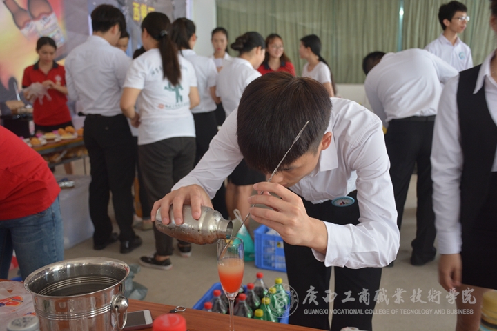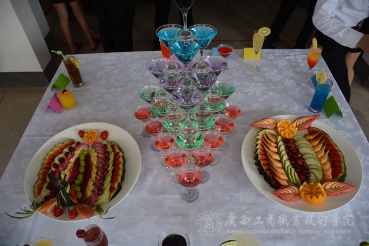 只見(jiàn)活動(dòng)開(kāi)始,調(diào)酒師們調(diào)制了五種顏色不一樣的雞尾酒,并將它們搭建成一座“金字塔”,成為展演過(guò)程中的一大亮點(diǎn),吸引了許多同學(xué)圍觀(guān)并拍照留念。