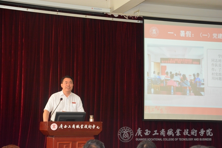 ?????? 隨后,由陳杰做開學工作報告。陳杰主要從暑假工作、開學工作、學期重點工作三大方面進行報告。他回顧總結(jié)了暑假期間黨建、教學、學工、人才、服務、民生、武鳴校區(qū)建設(shè)等各項工作開展情況,并做了開學工作及學期重點工作安排。報告將“堅持黨的領(lǐng)導,落實管黨治黨、辦學治校主體責任”等六項黨建工作和持續(xù)推動以“提高教師素質(zhì)”為重點的教學水平升級等五項行政工作作為重點工作。