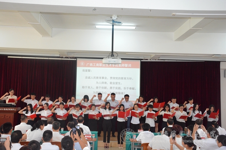 ?????? 會上,20多名新進教師在黨委組織部(人事處)副部長陶榮的帶領(lǐng)下上臺進行入職宣誓儀式。“我宣誓:忠誠人民教育事業(yè),貫徹黨的教育方針。為人師表,敬業(yè)愛生。 勤于育人,善于創(chuàng)新,勇于實踐,樂于奉獻。為國家立心,為民族鑄魂!”隨著一聲聲鏗鏘有利的誓言響起,全場響起一片熱烈的掌聲。