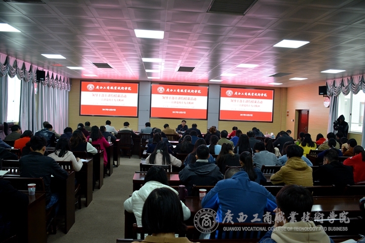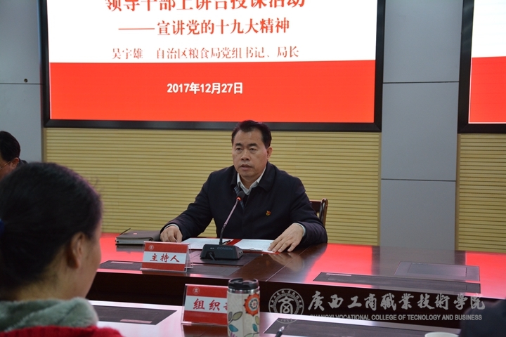 12月27日上午,2017年廣西領(lǐng)導(dǎo)干部上講臺開展思想政治教育報告會在我院校本部舉行。自治區(qū)糧食局黨組書記、局長吳宇雄同志作學(xué)習(xí)黨的十九大精神宣講報告。報告會由學(xué)院黨委副書記、院長陳杰主持,黨委副書記、紀(jì)委書記蒙啟成、副院長李仕欽出席報告會。