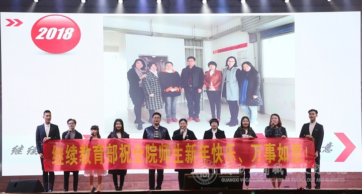 ? ? ? ? 1月5日晚,我院在校本部文體館舉行2018年教職工迎新晚會。學院領導黨委書記覃武云,黨委副書記、紀委書記蒙啟成,副院長李仕欽,副院長李維親臨現(xiàn)場欣賞晚會。參加和觀看晚會的還有學院全體教職員工及2016級、2017級學生代表。據(jù)悉,本次晚會共20個節(jié)目參演,形式多樣,內(nèi)容豐富。