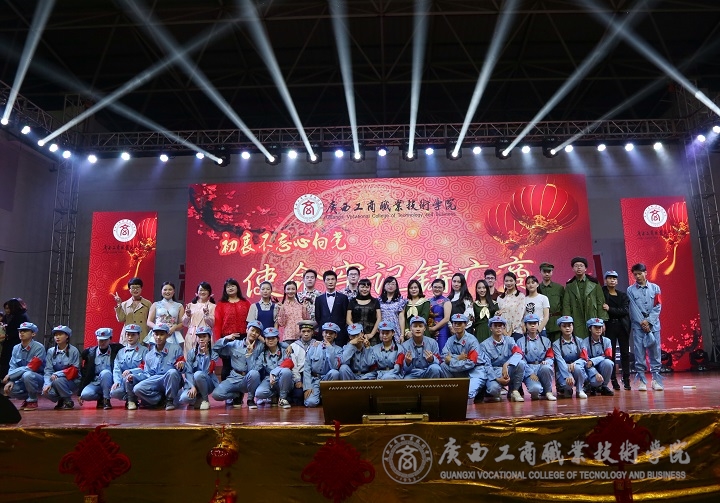 ? ? ? 整場晚會精彩不斷,高潮迭起,觀眾歡呼聲此起彼伏。晚會在社科部全體教師的《不忘初心,壯麗起航》中落下帷幕。晚會穿插的互動節(jié)目吸引著現(xiàn)場觀眾的積極參與,臺上臺下互動頻繁,融為一體。本次晚會在老師和同學們的共同努力下取得圓滿成功。以“初衷不忘心向黨,使命牢記鑄廣商”為主題,給同學們帶來了一場視覺與聽覺的文化盛宴。晚會結束后,全體工作人員與參演的教師、學生一起上臺合影留念。