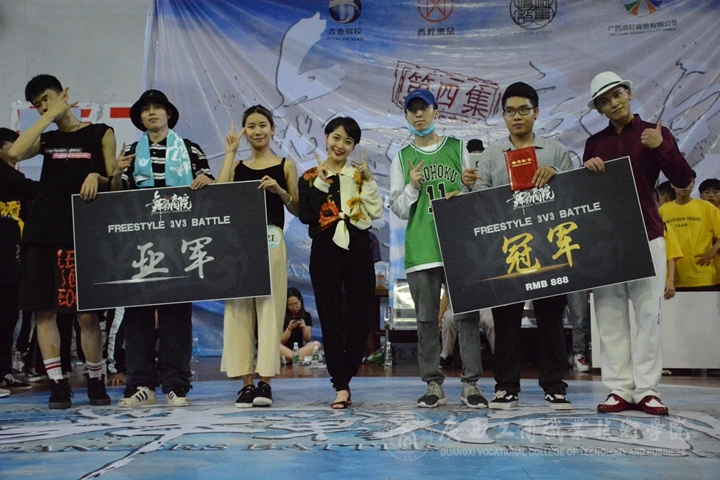 ? ? ? ? 最后經(jīng)過激烈的決戰(zhàn),“飛龍?jiān)谔臁睉?zhàn)隊(duì)冠軍贏得了freestyle3v3賽項(xiàng)的冠軍,“西城老男孩”拿下了Breaking賽項(xiàng)的冠軍,來自南寧職業(yè)技術(shù)學(xué)院的阿威贏得了seven to somke單人車輪戰(zhàn)的冠軍。賽后,來來老師和貓仔老師表演個(gè)人solo,在觀眾們熱烈的歡叫聲中,本次“舞戰(zhàn)商院”街舞大賽圓滿結(jié)束。