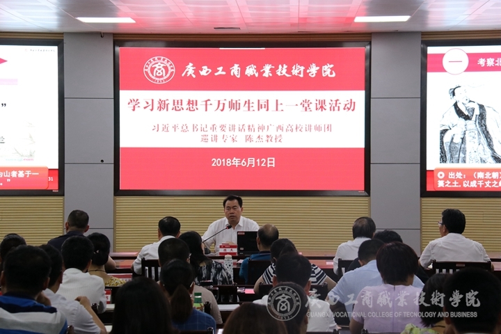 ? ? ? ? 為深入學習宣傳貫徹習近平總書記在北京大學師生座談會和紀念馬克思誕辰200周年大會上重要講話精神,按照教育部要求,學院于6月12日下午在鵬飛校區(qū)會議室開展“學習新思想千萬師生同上一堂課”活動。本次學習活動由學院院長、習近平總書記重要講話精神高校講師團巡講專家陳杰教授主講,學院黨委書記覃武云、黨委副書記、紀委書記蒙啟成、副院長李仕欽、副院長陳寧春出席活動,學院黨委委員、紀委委員,中層以上干部,各黨總支、直屬黨支部委員及學生代表參加活動。本次活動由覃武云書記主持。