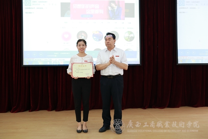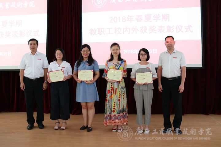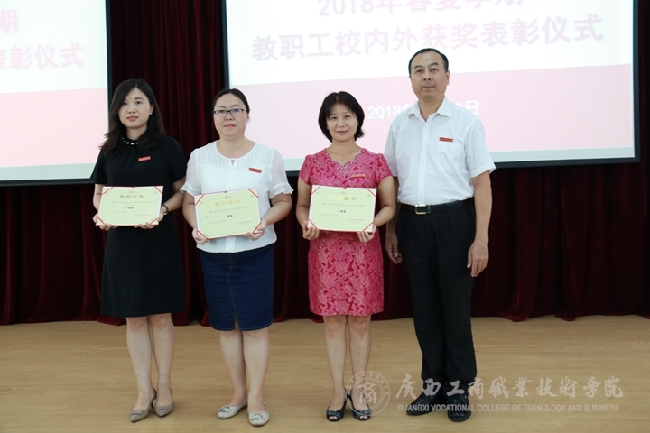?????? 會(huì)上進(jìn)行了2018年春夏學(xué)期教職工校內(nèi)外獲獎(jiǎng)表彰儀式。首先由副院長(zhǎng)李維、副院長(zhǎng)陳寧春為獲得學(xué)院2017-2018學(xué)年第二學(xué)期青年教師教學(xué)基本功競(jìng)賽獲獎(jiǎng)代表譚玉娥、傅甜甜、李洪業(yè)、黃蘭君老師頒獎(jiǎng)。黨委副書記、紀(jì)委書記蒙啟成為學(xué)院2018年高級(jí)教師“精彩一課”比賽獲獎(jiǎng)代表高潔、張利、粟衛(wèi)紅老師頒獎(jiǎng)。陳杰為獲得2018年上半年校外獲獎(jiǎng)教師代表,獲得第七屆廣西高校輔導(dǎo)員素質(zhì)能力大賽一等獎(jiǎng)的郭曼老師頒獎(jiǎng)。