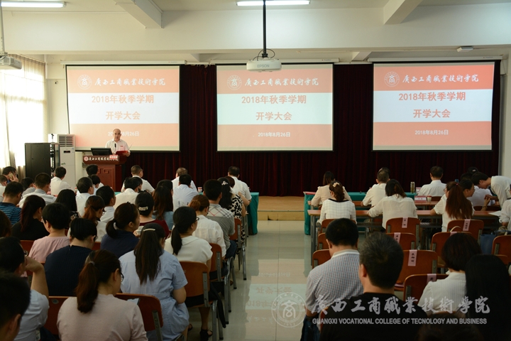 2018年8月26日上午,我院于鵬飛校區(qū)報(bào)告廳舉行2018年秋季學(xué)期開學(xué)大會(huì),全體學(xué)院領(lǐng)導(dǎo)及教職員工參加了本次會(huì)議。會(huì)議由學(xué)院黨委書記覃武云主持,學(xué)院院長(zhǎng)陳杰在會(huì)上作開學(xué)報(bào)告。