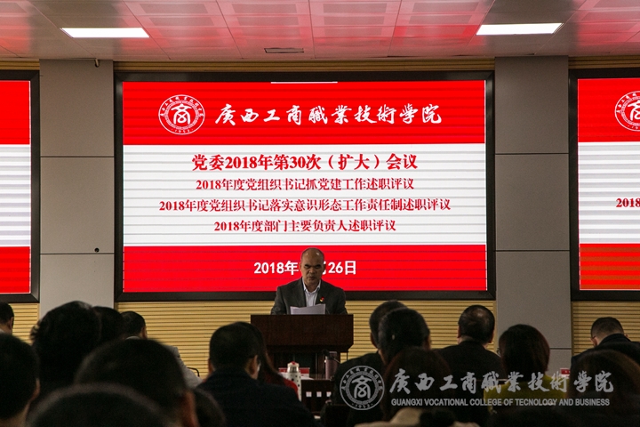 2018年12月26日上午,學(xué)院黨委于校本部2119會(huì)議室召開2018年第三十次(擴(kuò)大)會(huì)議,專題聽取各黨總支、各直屬黨支部書記和各部門主要負(fù)責(zé)人作2018年度述職報(bào)告。學(xué)院黨委書記覃武云、黨委副書記、紀(jì)委書記蒙啟成、副院長、黨委委員李仕欽、副院長、黨委委員李維、副院長、黨委委員陳寧春、黨委委員蔣百平、黨委委員林雯出席會(huì)議,本次會(huì)議由覃武云主持。學(xué)院中層管理人員、教代會(huì)代表、各黨總支、直屬黨支部委員、組織員、黨委部門職工代表列席。
