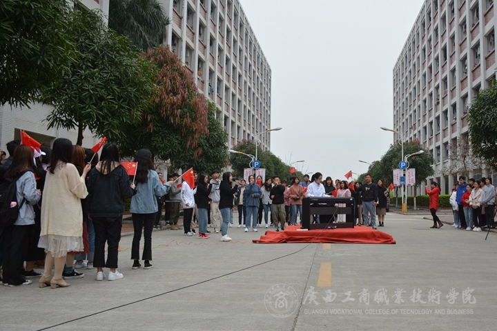 ??????? “我和我的祖國,一刻也不能分割”。2019年3月1日中午,洪亮的歌聲在校園主干道上唱響,院大學(xué)生藝術(shù)團(tuán)、音樂協(xié)會等學(xué)生代表開展的快閃活動吸引了眾多師生前來觀看。