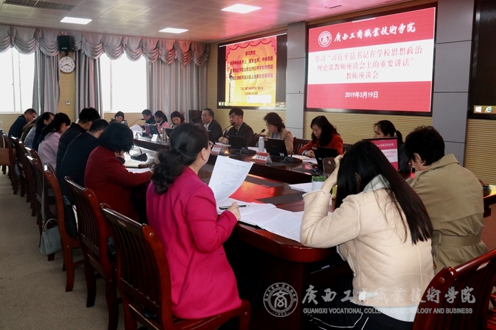 ??????? 2019年3月19日下午,我院新時(shí)代講習(xí)所在鵬飛校區(qū)視頻會(huì)議室召開(kāi)“學(xué)習(xí)習(xí)近平總書(shū)記在學(xué)校思想政治理論課教師座談會(huì)上的重要講話精神”教師座談會(huì),并將該座談會(huì)作為我院新時(shí)代講習(xí)所成立以來(lái)講習(xí)活動(dòng)的第一講。學(xué)院新時(shí)代講習(xí)所副所長(zhǎng)、黨委副書(shū)記、紀(jì)委書(shū)記蒙啟成出席講習(xí)活動(dòng)并主持會(huì)議,思政部全體思想政治理論課教師參加了會(huì)議,宣傳部、教務(wù)科研處、學(xué)生工作部、教師工作部派代表參加了會(huì)議。