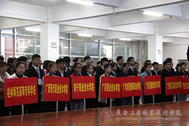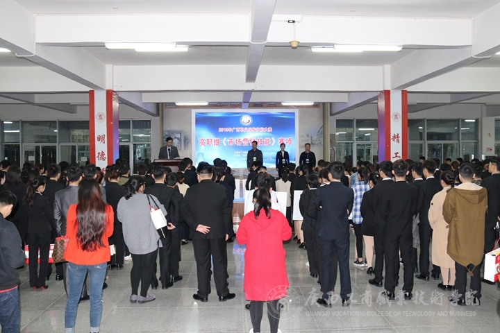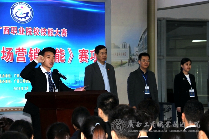 ? ? ? ? ?2019年3月23日,由廣西壯族自治區(qū)教育廳主辦,廣西工商職業(yè)技術學院承辦的“2019年廣西職業(yè)院校技能大賽(高職組)市場營銷技能賽項”啟動儀式在該校鵬飛校區(qū)文體館一樓舉行,廣西工商職業(yè)技術學院副院長李維、裁判長韋濱、裁判員代表韋荷琳、經(jīng)管系黨總支書記莫春華出席開幕式,裁判組全體成員和各參賽隊領隊、指導老師和參賽選手及相關工作人員參加開幕式。開幕式由教務科研處副處長李紅梅主持。