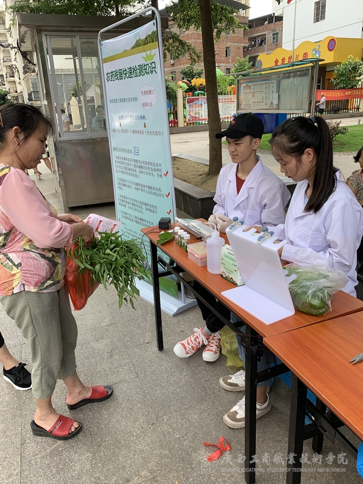 果蔬農(nóng)殘快速檢測(cè)的桌前,食檢專業(yè)的同學(xué)們?cè)趯?duì)居民們從家里拿來(lái)的蔬菜進(jìn)行農(nóng)藥殘留檢測(cè)。在等待結(jié)果的過程里,同學(xué)們向居民講解如何清洗果蔬能更有效地去除農(nóng)藥殘留等一些清洗小技巧,深受社區(qū)群眾歡迎。