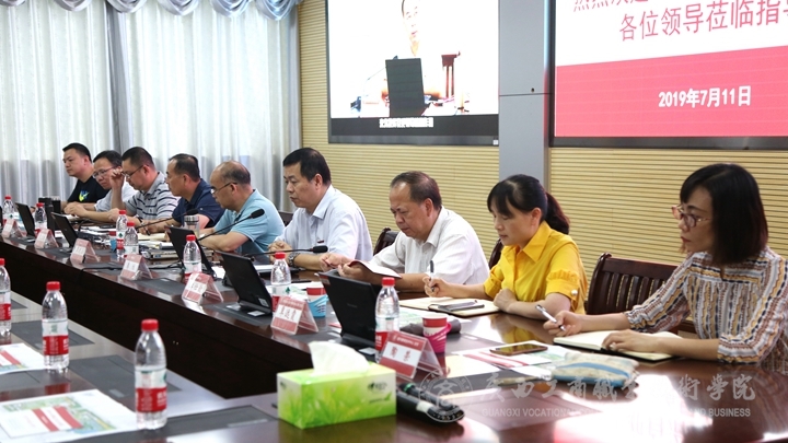 ??????? 7月11日下午,自治區(qū)教育廳職成處處長(zhǎng)覃壯才、副處長(zhǎng)黃云奇一行7人蒞臨我院檢查指導(dǎo)工作并開展“不忘初心、牢記使命”專題調(diào)研活動(dòng)。學(xué)院全體領(lǐng)導(dǎo)班子成員和相關(guān)部門負(fù)責(zé)人參加座談交流。