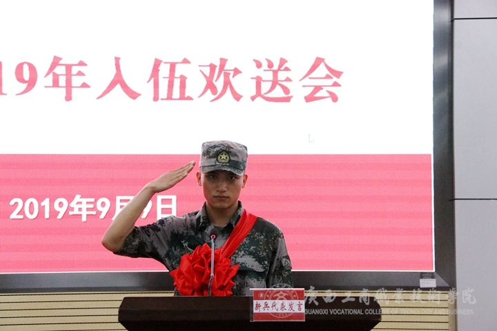 ? ? ? ? 第三項議程為新兵代表工商1708班蒙立漢同學(xué)發(fā)言。他表示很榮幸能代表即將奔赴軍營的新兵抒發(fā)戰(zhàn)士的豪情與決心。在他很小的時候有這樣一個夢想,作為一名共和國衛(wèi)兵穿上威武的軍裝,參軍的夢想已經(jīng)融入血液,融入細(xì)胞,成為心中時時刻刻澎湃的浪濤。他表示,黨和國家號召我們青年大學(xué)生積極參軍,這是歷史賦予我們的重任,也是有志青年應(yīng)該履行的義務(wù)。加強國防力量,捍衛(wèi)共和國的主權(quán)和領(lǐng)土完整,保衛(wèi)世界和平,我們就是抱著這樣的決心在報名冊上莊嚴(yán)地寫下自己的名字。