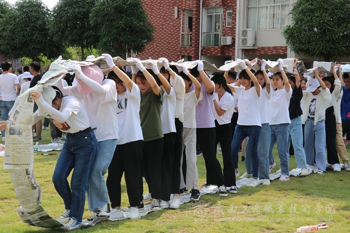? ? ? ? 緊接著第二個游戲“無敵風(fēng)火輪”,以分配足夠的報紙、膠帶、剪刀,用不同的方法將報紙一張張粘貼起來,必須動作迅速,完成后所有成員都要進去,保持大家的步伐一致,同時報紙不能破損,這考驗著各班同學(xué)的組織、協(xié)調(diào)能力以及指揮者一絲不茍的工作態(tài)度;