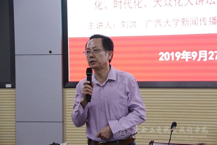 9月27日晚上,我院于鵬飛校區(qū)教學樓視頻會議室召開弘揚馬克思主義中國化、時代化、大眾化大講壇—以新聞學為例專題講座。廣西大學新聞傳播學院常務副院長、碩士研究生導師劉洪教授、廣西發(fā)展戰(zhàn)略研究會副會長徐海麗同志出席會議,學院各部門分管宣傳工作的領導和宣傳人員、學院黨委宣傳部全體工作人員、學院各學生組織、學生社團宣傳工作宣傳部部長、學院黨委宣傳部新聞中心全體學生記者、學院大學生記者團全體學生記者以及2019級新生積極分子參加本次講座。本次會議由黨委宣傳部新聞中心指導老師莫惘主持。