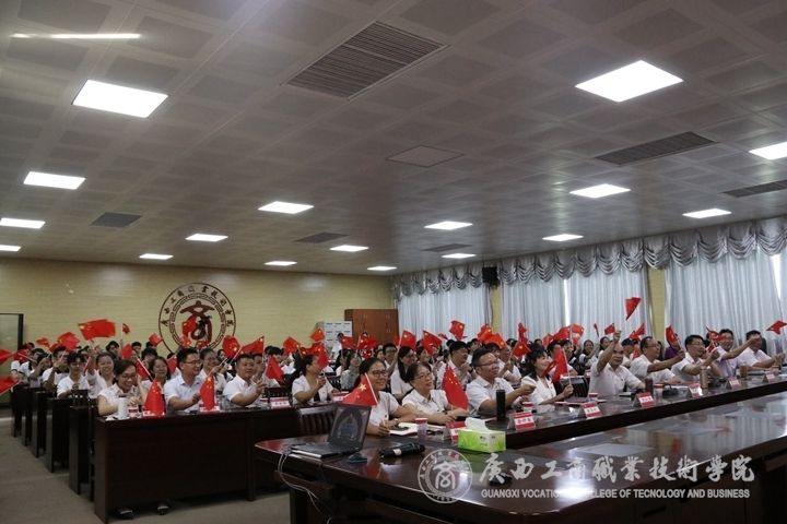 ? ? ? ? 10月1日上午,慶祝中華人民共和國(guó)成立70周年大會(huì)在北京隆重舉行。北京天安門(mén)廣場(chǎng)紅旗飄揚(yáng),鼓樂(lè)齊鳴。為認(rèn)真學(xué)習(xí)習(xí)近平總書(shū)記重要講話精神,歡度國(guó)慶,共襄盛舉,根據(jù)“不忘初心、牢記使命”主題教育有關(guān)工作安排,在廣西工商職業(yè)技術(shù)學(xué)院鵬飛校區(qū)視頻會(huì)議室里,學(xué)院領(lǐng)導(dǎo)、各部門(mén)、各單位中層領(lǐng)導(dǎo)干部和師生代表也懷著喜悅和激動(dòng)的心情,齊聚一堂,集中收看慶祝中華人民共和國(guó)成立70周年大會(huì)現(xiàn)場(chǎng)直播。