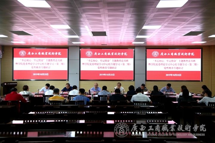 ???????10月23日下午,中共廣西工商職業(yè)技術(shù)學(xué)院委員會(huì)召開第二期“不忘初心、牢記使命”主題教育讀書班暨學(xué)院黨委理論學(xué)習(xí)中心組專題研討的黨性修養(yǎng)專題研討會(huì)。學(xué)院領(lǐng)導(dǎo),黨委委員,學(xué)院各部門、各單位主要負(fù)責(zé)人(中共黨員),學(xué)院工會(huì)、團(tuán)委主要負(fù)責(zé)人,其他處級(jí)以上的黨委領(lǐng)導(dǎo)干部參加了研討,學(xué)院黨委書記覃武云主持本次專題研討。
