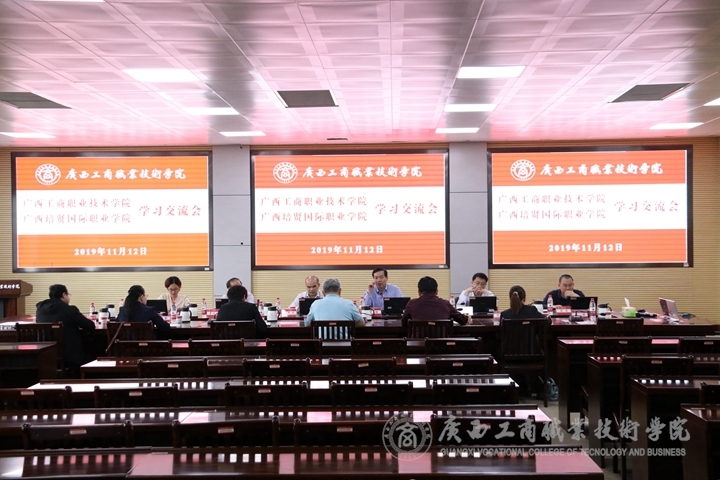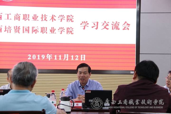 ? ? ? ? 隨后,交流雙方在我院鵬飛校區(qū)會(huì)議室開展學(xué)習(xí)交流座談會(huì)。會(huì)上,首先播放了我院宣傳片,李維院長(zhǎng)結(jié)合宣傳片內(nèi)容,從我院辦學(xué)歷史、辦學(xué)規(guī)模、辦學(xué)專業(yè)、師資隊(duì)伍、辦學(xué)理念、辦學(xué)成果等方面介紹了學(xué)校的基本情況。接著由鄭華副書記介紹我院“不忘初心、牢記使命”主題教育工作開展情況;蔣百平部長(zhǎng)介紹學(xué)院黨的組織建設(shè)、黨建品牌項(xiàng)目建設(shè)、黨員活動(dòng)創(chuàng)新形式等工作開展情況;最后林寧校長(zhǎng)發(fā)言,他表示,我院選派譚波同志到廣西培賢國(guó)際職業(yè)學(xué)院掛職擔(dān)任學(xué)院黨總支書記、督導(dǎo)專員,在優(yōu)秀的師資、規(guī)范的管理,較強(qiáng)的教學(xué)科研能力中發(fā)揮了良好的帶頭作用。他對(duì)廣商院66年披荊斬棘的發(fā)展歷史表示感慨,對(duì)我院所獲得的教學(xué)成果獎(jiǎng)充分肯定贊賞,并表示將向我院學(xué)習(xí),狠抓教師隊(duì)伍的建設(shè),狠抓教師能力的建設(shè),狠抓教師科研能力的提升。