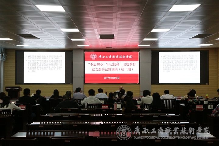 ? ? ? ? 11月12日下午,中共廣西工商職業(yè)技術(shù)學(xué)院委員會(huì)“不忘初心、牢記使命”主題教育第二期黨支部書記輪訓(xùn)班開班。本次輪訓(xùn)課由學(xué)院黨委書記覃武云主講。學(xué)院各黨總支書記、黨支部書記、學(xué)院“不忘初心、牢記使命”主題教育領(lǐng)導(dǎo)小組辦公室相關(guān)人員參加了本次輪訓(xùn)。