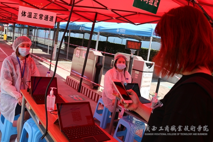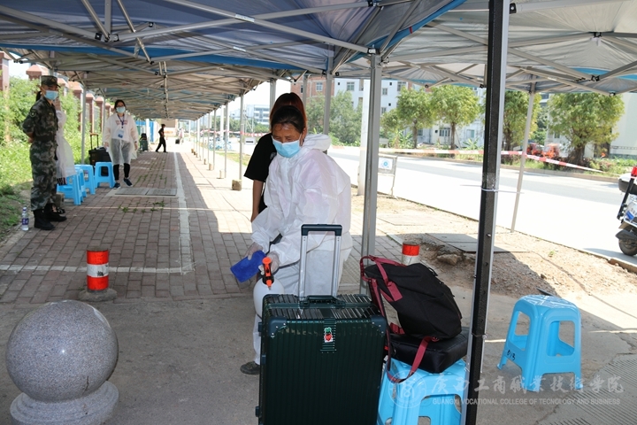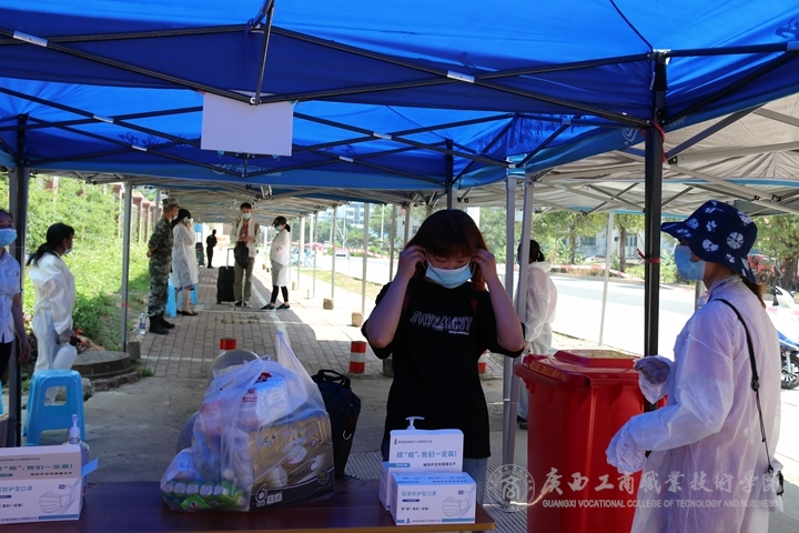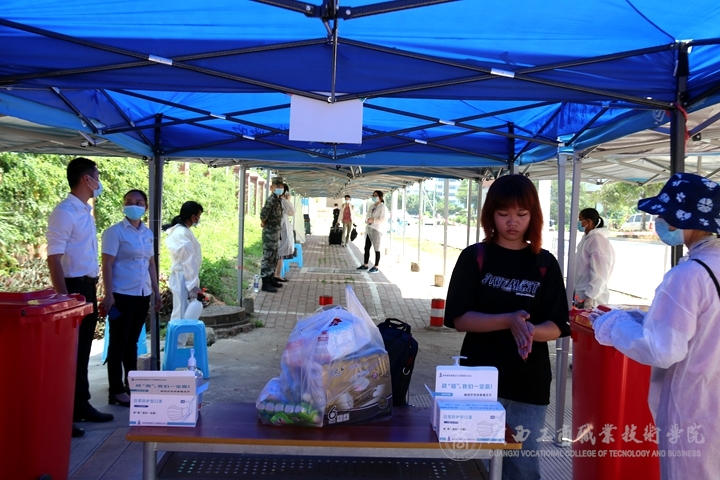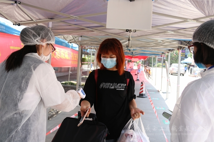 2020年5月6日上午11點(diǎn),有著淡黃蓬松頭發(fā),穿著黑色T裇的黃小玲拉著大大的行李箱,背著手提電腦,拿著一袋零食,踏著輕快的步伐走出了地鐵口,又很快來(lái)到了廣西工商職業(yè)技術(shù)學(xué)院的大門外。在這里,一溜煙布好的帳篷和分列在不同崗位的教職員工已經(jīng)嚴(yán)陣以待,等待黃小玲的是一系列嚴(yán)格而細(xì)致的入校程序。