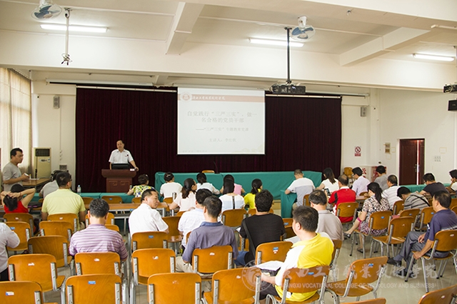 2015年5月28日下午,由李仕欽副院長主講的《自覺踐行“三嚴三實”做一名合格的黨員干部》“三嚴三實”專題教育黨課在我院校本部2145報告廳開講,學院各部門的相關(guān)負責人代表當場聽課。
