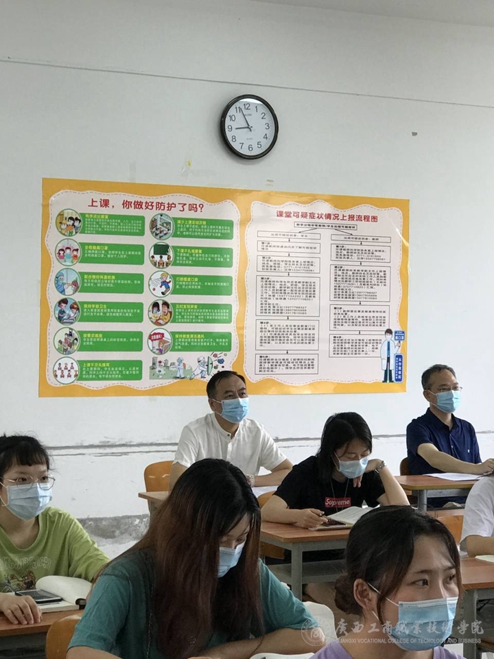 2020年5月11日是學(xué)生返校面授上課的第一天,學(xué)院黨委書記覃武云、副書記蒙啟成、教務(wù)科研處副處長李紅梅及會計系主任張首楠、副主任粟衛(wèi)紅等到上課教室開展開學(xué)第一課的聽課檢查活動。 覃武云、李紅梅、張首楠、覃鋆鋆等聽取了雷荔珺老師的《企業(yè)內(nèi)部控制》課程和王詩珣老師的《管理會計》課程,蒙啟成、汪波、粟衛(wèi)紅、吳明等聽取了盧海妮、邱越勝老師的《財務(wù)管理》和《管理會計》課程。在教室里,我們看到所有面授的教室都按要求在座位上貼了標(biāo)簽,學(xué)生老師全程配戴口罩按標(biāo)簽就座,進(jìn)教室后由班干測量體溫并用免洗洗手液消毒后進(jìn)入座位聽課。