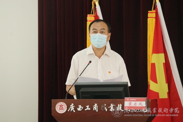 2020年6月30日下午,我院于鵬飛校區(qū)教學(xué)樓會(huì)議室召開慶祝中國共產(chǎn)黨建黨99周年黨員大會(huì)。學(xué)院黨委書記覃武云、黨委副書記蒙啟成、副院長(zhǎng)陳寧春、副院長(zhǎng)闕勇平、紀(jì)委書記韋云鳳,學(xué)院中層以上黨員干部、各支部書記、委員,學(xué)院2019-2020學(xué)年度優(yōu)秀共產(chǎn)黨員、優(yōu)秀黨務(wù)工作者、先進(jìn)基層黨組織代表參加本次會(huì)議。本次會(huì)議由蒙啟成同志主持。
