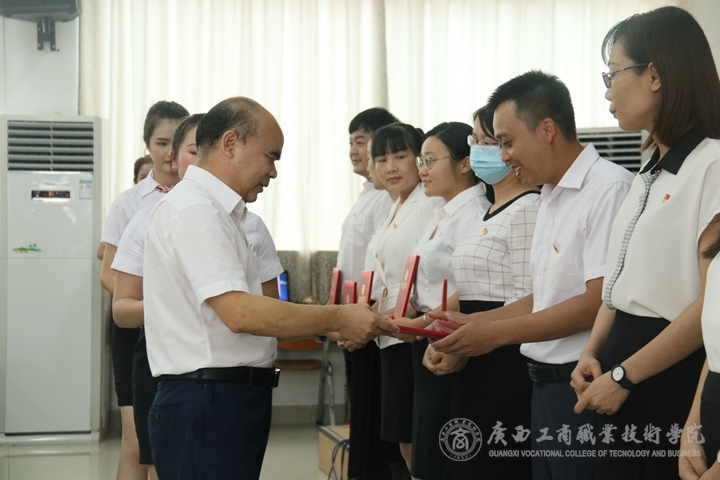 覃武云書記為榮獲學(xué)院優(yōu)秀黨務(wù)工作者同志頒發(fā)證書
