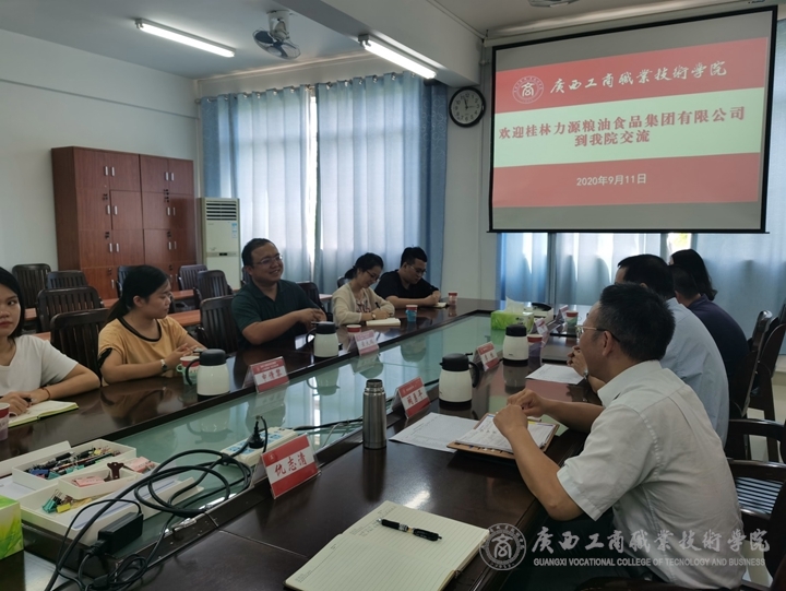2020年9月11日下午,桂林力源糧油食品集團(tuán)有限公司董事兼人力資源總監(jiān)黃大鵬、集團(tuán)人力資源部廣西區(qū)域經(jīng)理申倩黎等6人到我院進(jìn)行校企合作交流,學(xué)院院長(zhǎng)李維、副院長(zhǎng)闕勇平、教務(wù)處副處長(zhǎng)蘇波等5人參加此次交流會(huì)。