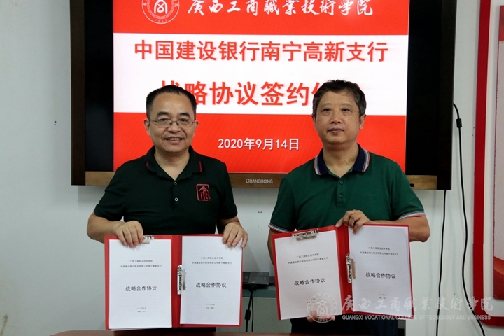 為了加強銀校合作,2020年9月14日下午,學院與中國建設銀行股份有限公司南寧高新支行舉行《戰(zhàn)略合作協(xié)議》簽署儀式。