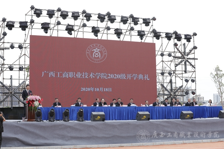金秋十月,晴空萬里。2020年10月18日上午,廣西工商職業(yè)技術(shù)學(xué)院隆重舉行武鳴校區(qū)啟用儀式暨2020級(jí)武鳴校區(qū)新生開學(xué)典禮。自治區(qū)發(fā)展改革委黨組成員、自治區(qū)糧食和物資儲(chǔ)備局黨組書記、局長(zhǎng)吳宇雄,自治區(qū)糧食和物資儲(chǔ)備局黨組成員、副局長(zhǎng)李國(guó)平,自治區(qū)糧食和物資儲(chǔ)備局一級(jí)巡視員林愈溪,自治區(qū)教育廳基建處處長(zhǎng)陳標(biāo)智,南寧市武鳴區(qū)副區(qū)長(zhǎng)陸耀忠,南寧教育園區(qū)規(guī)劃建設(shè)現(xiàn)場(chǎng)指揮部常務(wù)副指揮長(zhǎng)劉岱青,廣西工商技師學(xué)院院長(zhǎng)、黨委書記楊靜錦,自治區(qū)糧食和物資儲(chǔ)備局、南寧教育園區(qū)、武鳴區(qū)相關(guān)領(lǐng)導(dǎo)和企事業(yè)單位嘉賓、職教集團(tuán)理事單位、校友代表、施工單位代表、設(shè)計(jì)單位代表、監(jiān)理單位代表,廣西工商職業(yè)技術(shù)學(xué)院領(lǐng)導(dǎo)、學(xué)院各部門主要負(fù)責(zé)人、教師代表、離退休領(lǐng)導(dǎo)和教師代表、學(xué)生代表等參加活動(dòng),共同見證學(xué)院發(fā)展史上具有新的里程碑意義的輝煌時(shí)刻。