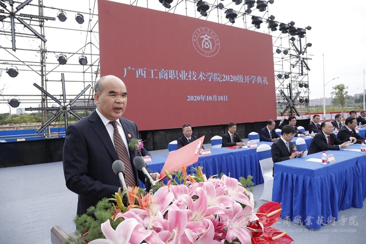 啟用儀式結(jié)束后,上午10時(shí)10分,召開了2020級(jí)武鳴校區(qū)新生開學(xué)典禮。大會(huì)由學(xué)院黨委書記覃武云主持,自治區(qū)發(fā)展改革委黨組成員、自治區(qū)糧食和物資儲(chǔ)備局黨組書記、局長(zhǎng)吳宇雄在會(huì)上致辭。