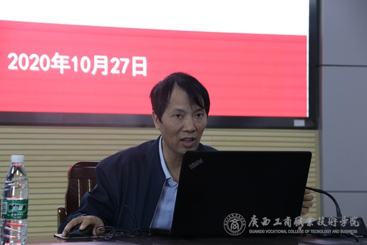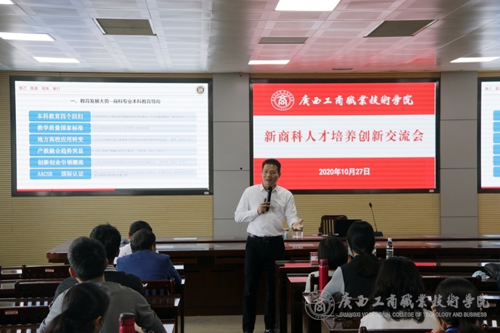 2020年10月27日上午,在鵬飛校區(qū)教學(xué)樓2119會(huì)議室舉辦主題為“新商科人才培養(yǎng)”的創(chuàng)新交流會(huì),并邀請兩位校外專家對校內(nèi)老師和2020年廣西高職院校技能大賽企業(yè)管理模擬沙盤賽項(xiàng)指導(dǎo)老師進(jìn)行講座和交流指導(dǎo),他們分別是廣西財(cái)經(jīng)學(xué)院人事處處長(原工商管理學(xué)院院長)梁儒謙教授、南寧師范大學(xué)職業(yè)技術(shù)教育學(xué)院數(shù)字媒體技術(shù)系主任鄭小軍教授。本次交流會(huì)由我校經(jīng)貿(mào)學(xué)院院長張煌強(qiáng)主持。