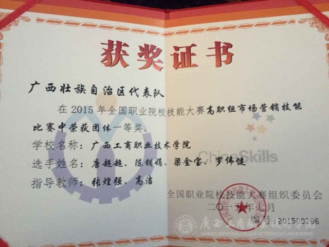據(jù)來自無錫的最新消息,我院市場(chǎng)營銷代表隊(duì)在今天下午剛剛結(jié)束的2015年全國職業(yè)院校技能大賽高職組市場(chǎng)營銷技能比賽中榮獲團(tuán)體一等獎(jiǎng)!這是我院首次在同一類別的國賽中榮獲一等獎(jiǎng)!也是今年廣西參賽團(tuán)隊(duì)在高職組市場(chǎng)營銷技能比賽中所獲得的唯一一個(gè)一等獎(jiǎng)!