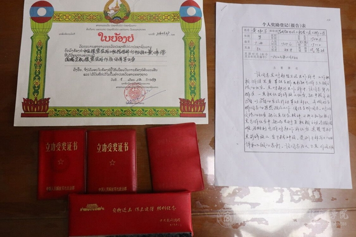 黃老師對(duì)學(xué)院師生的帶來表示歡迎,他熱情地找出了參加戰(zhàn)爭(zhēng)的證書、紀(jì)念冊(cè),與同學(xué)們分享他的人生經(jīng)歷。黃偉學(xué)老師17歲時(shí)參軍入伍,18歲時(shí)奉命前往老撾執(zhí)行筑路作戰(zhàn)保障任務(wù),28歲時(shí),作為排長率領(lǐng)全排參加了對(duì)越自衛(wèi)反擊戰(zhàn),出色完成戰(zhàn)場(chǎng)通信保障任務(wù),榮立二等功。33歲時(shí),黃老師再上戰(zhàn)場(chǎng),在收復(fù)老山、者陰山作戰(zhàn)中榮立三等功。轉(zhuǎn)業(yè)后,黃老師來到我院工作,一直在政工科、學(xué)生科、保衛(wèi)科、總務(wù)科、后勤處等部門積極發(fā)揮黨員的先鋒模范作用,退休后仍發(fā)揮余熱,為學(xué)院教職工住宅樓建設(shè)貢獻(xiàn)力量。