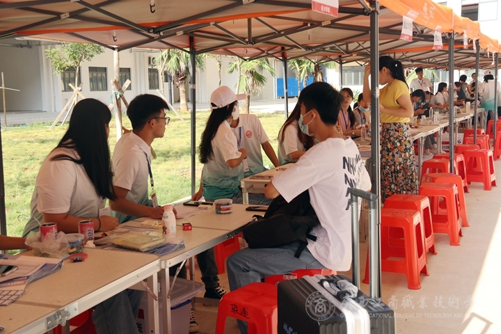 在校門口,新生根據(jù)報(bào)道流程,掃健康碼、消毒、測體溫后由校園志愿者接送到報(bào)到處。報(bào)到現(xiàn)場,各班班助有序地為新生做好報(bào)到登記、安排宿舍、飯卡發(fā)放等工作,耐心地為新生、家長答疑解惑。學(xué)生志愿者們?yōu)樾律_啟了“一站式迎新”服務(wù),從交驗(yàn)材料、繳費(fèi)注冊,到存放行李、核驗(yàn)新生身份等每一個(gè)流程和環(huán)節(jié)都有學(xué)生志愿者們的熱情引導(dǎo),悉心服務(wù)。后勤部在各宿舍、路口等地方設(shè)工作點(diǎn),保衛(wèi)師傅一手抓疫情防控、一手抓校園安保,同時(shí)進(jìn)行車流引導(dǎo)、協(xié)調(diào)校園交通,為迎新工作的有序進(jìn)行保駕護(hù)航。