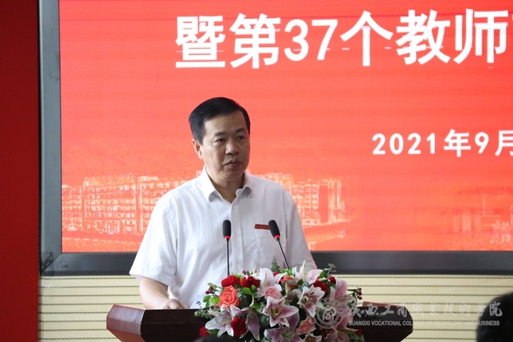 最后,覃武云書記講話,他代表全院師生對六千余名2021級新生致以最熱烈的歡迎和最真誠的祝賀,歡迎新同學(xué)來到廣商院,作為新一代大學(xué)生,將個人理想與中華民族偉大復(fù)興的中國夢相結(jié)合,為建設(shè)壯美廣西、建設(shè)社會主義現(xiàn)代化強(qiáng)國做出自己的貢獻(xiàn)。他代表學(xué)院黨委及領(lǐng)導(dǎo)班子向默默耕耘在教育教學(xué)第一線的廣大教師致以節(jié)日的問候,希望新入職教師牢記使命、磨練本領(lǐng)、扎根教育事業(yè)不斷奉獻(xiàn),做好學(xué)生的引路人。