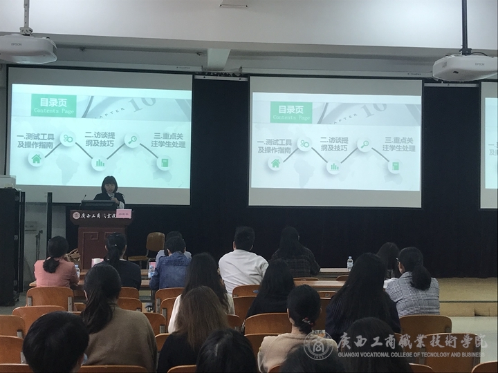 培訓(xùn)分為兩個(gè)部分,先由學(xué)院心理健康教育與咨詢中心劉便榮老師對(duì)我院2021年學(xué)生心理普查情況進(jìn)行匯報(bào);然后由廣西農(nóng)業(yè)職業(yè)技術(shù)大學(xué)心理健康中心主任路曉華同志對(duì)普查所采用的SCL-90量表進(jìn)行分析,并對(duì)深度訪談的過程及約談技巧進(jìn)行分享,整場(chǎng)培訓(xùn)案例豐富、生動(dòng)精彩,為在校教師進(jìn)一步做好學(xué)生心理健康工作提供了有力支持。