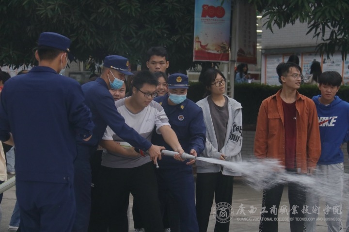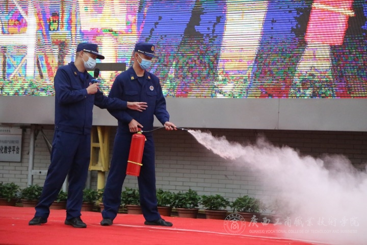 南寧市西鄉(xiāng)塘區(qū)城西消防救援站的指導(dǎo)員和新陽消防救援站的指導(dǎo)員為我院師生講授消防安全知識(shí),他們通過火災(zāi)現(xiàn)場(chǎng)的影像資料,圖文并茂的為廣大師生講解了火災(zāi)的危害性、樓層發(fā)生火災(zāi)后的逃生與自救方法、如何使用滅火設(shè)施。消防安全知識(shí)講解結(jié)束后,消防員做了滅火操作的演示,并邀請(qǐng)部分師生現(xiàn)場(chǎng)操作滅火器。在消防員的指導(dǎo)下,師生體驗(yàn)者們提著滅火器,按照滅火步驟和方法,將白色的粉末噴向大火,將明火撲滅。