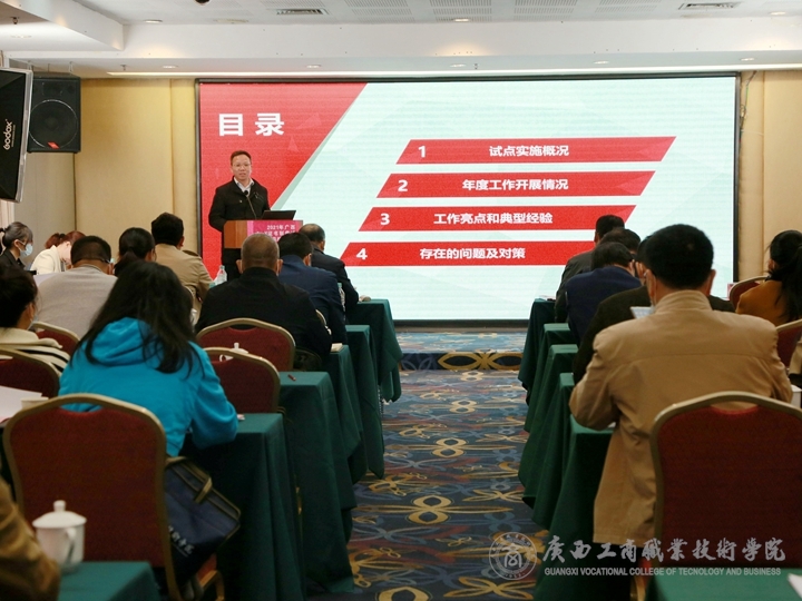 會(huì)議共有六項(xiàng)議程,一是由廣西1+X秘書處掛靠單位廣西工商職業(yè)技術(shù)學(xué)院黨委書記覃武云致歡迎詞,二是南寧職業(yè)技術(shù)學(xué)院、廣西交通職業(yè)技術(shù)學(xué)院、廣西工商職業(yè)技術(shù)學(xué)院、廣西玉林農(nóng)業(yè)學(xué)校、南寧第四職業(yè)技術(shù)學(xué)校等五家試點(diǎn)院校代表經(jīng)驗(yàn)交流,三是培訓(xùn)評(píng)價(jià)組織北京鴻科經(jīng)緯科技有限公司、北京中車行高新技術(shù)有限公司兩位代表經(jīng)驗(yàn)分享,四是秘書長(zhǎng)闕勇平作2021年1+X證書制度試點(diǎn)工作總結(jié),五是2021年多項(xiàng)重要成果發(fā)布,六是自治區(qū)教育廳覃壯才處長(zhǎng)做工作部署。