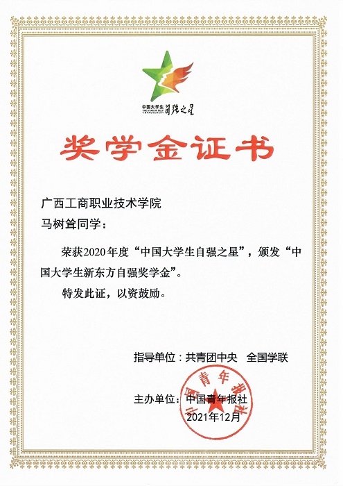 近日,由共青團中央、全國學聯指導,中國青年報社、新東方教育科技集團聯合開展的2020年度“中國大學生自強之星”獎學金評選活動結果揭曉。我院管理學院物流管理專業(yè)物流1803班何夢婷、工商企業(yè)管理專業(yè)工商1903班馬樹聳兩位同學榮獲2020年度“中國大學生自強之星”榮譽稱號,并獲得“中國大學生新東方自強獎學金”。