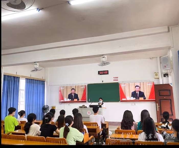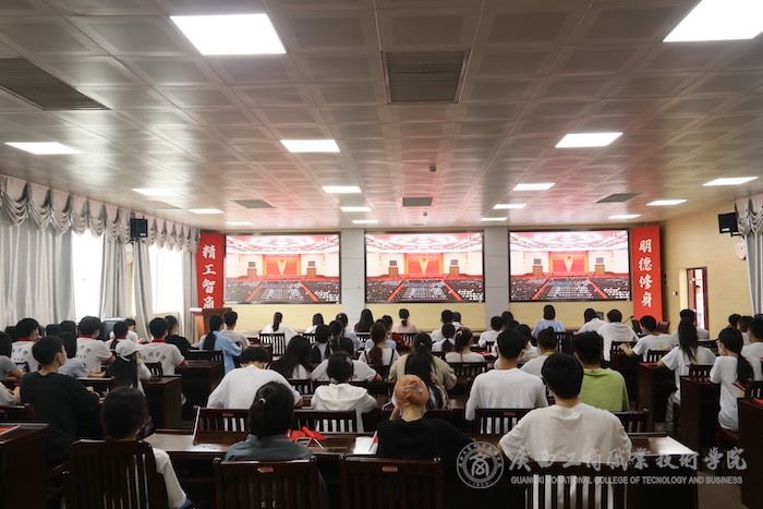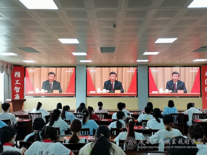 學(xué)院黨委書記覃武云、學(xué)院黨委副書記、院長李維、黨委副書記蒙啟成和學(xué)院領(lǐng)導(dǎo)班子其他成員及學(xué)院部門、各單位收看了大會直播。學(xué)院副院長安仲文、學(xué)院團委書記王娟和青年團員教師代表、校院兩級團學(xué)社學(xué)生干部代表、第四期青馬班學(xué)員、第六期鑄英班學(xué)員等90人在鵬飛校區(qū)2119會議室集中觀看了慶祝大會。各二級學(xué)院團委通過線下線上組織了226個團支部的9783名同學(xué)收看大會直播。