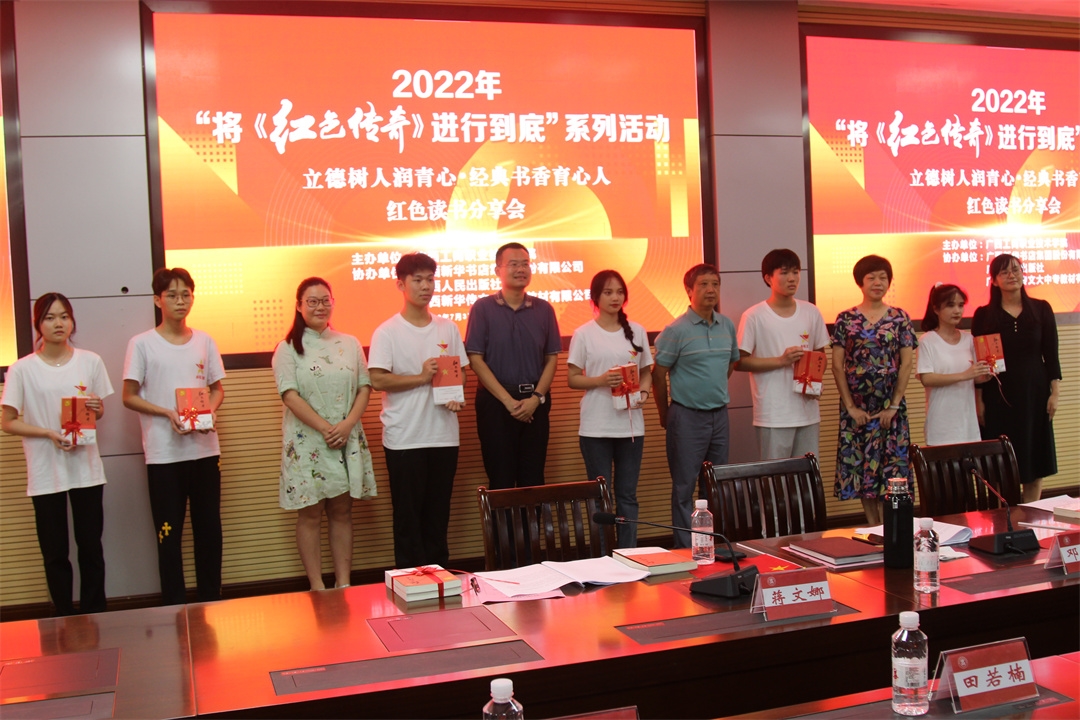分享會(huì)后,與會(huì)領(lǐng)導(dǎo)、嘉賓向?qū)W生代表贈(zèng)送《紅色傳奇》讀本,鼓勵(lì)同學(xué)們不忘初心,傳承廣西紅色基因,以飽滿(mǎn)的熱情面向未來(lái)。在《不忘初心》的合唱聲中,本次交流分享活動(dòng)圓滿(mǎn)結(jié)束。