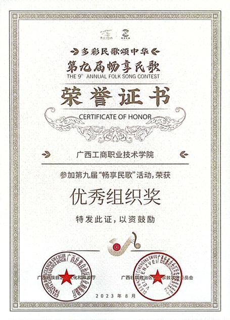 (我院榮獲第九屆“暢享民歌”活動“優(yōu)秀組織獎”榮譽證書)