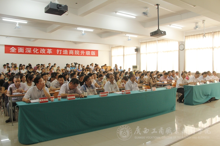 大會(huì)上,學(xué)院黨委書記覃武云作本學(xué)期期末大會(huì)報(bào)告。覃書記首先從十個(gè)方面回顧了這個(gè)學(xué)期來學(xué)院各項(xiàng)工作開展情況。一是加強(qiáng)黨的建設(shè)有新舉措。扎實(shí)開展“三嚴(yán)三實(shí)”專題教育,創(chuàng)新舉辦依法治校培訓(xùn)班,不斷加強(qiáng)黨員干部廉潔從政情況的監(jiān)督檢查,積極加強(qiáng)基層黨組織建設(shè)。二是以“提高教師素質(zhì)”為重點(diǎn)的教學(xué)水平升級(jí)有新成效。持續(xù)推進(jìn)“人才強(qiáng)?!睉?zhàn)略,全面加強(qiáng)課程和專業(yè)建設(shè),不斷創(chuàng)新人才培養(yǎng)模式,進(jìn)一步加大科研工作力度,繼續(xù)教育穩(wěn)步提升。三是以“強(qiáng)化干部執(zhí)行力”為重點(diǎn)的管理能力升級(jí)有新進(jìn)展。制定《學(xué)院章程》,推進(jìn)依法治校,強(qiáng)化規(guī)范管理,提升管理效能,完善督查制度,加強(qiáng)工作效率,加強(qiáng)干部隊(duì)伍建設(shè),提升管理質(zhì)量。四是以“教育信息化”為重點(diǎn)的服務(wù)環(huán)境升級(jí)有新提升。啟動(dòng)數(shù)字化校園建設(shè),完善信息化基礎(chǔ)設(shè)施。五是校園文化建設(shè)有新載體。全面推廣VI應(yīng)用,成功舉辦校慶日系列活動(dòng),扎實(shí)開展宣傳工作,積極開展文體活動(dòng)。六是學(xué)生管理工作有新局面。深入開展團(tuán)學(xué)工作,扎實(shí)開展心理健康教育和資助管理工作。七是招生就業(yè)工作有新成績(jī)。招生規(guī)模進(jìn)一步擴(kuò)大,畢業(yè)生就業(yè)工作穩(wěn)步推進(jìn),一批優(yōu)秀畢業(yè)生獲得表彰。八是師生參加各種技能大賽有新突破。學(xué)生喜獲國(guó)賽一等獎(jiǎng),教師榮獲多項(xiàng)表彰。九是民生建設(shè)有新進(jìn)展。工資調(diào)整工作順利完成,教職工住宅樓建成封頂。十是強(qiáng)化工作統(tǒng)籌和落實(shí)有新思路。年度工作層層分解任務(wù),年度工作中期檢查扎實(shí)開展。