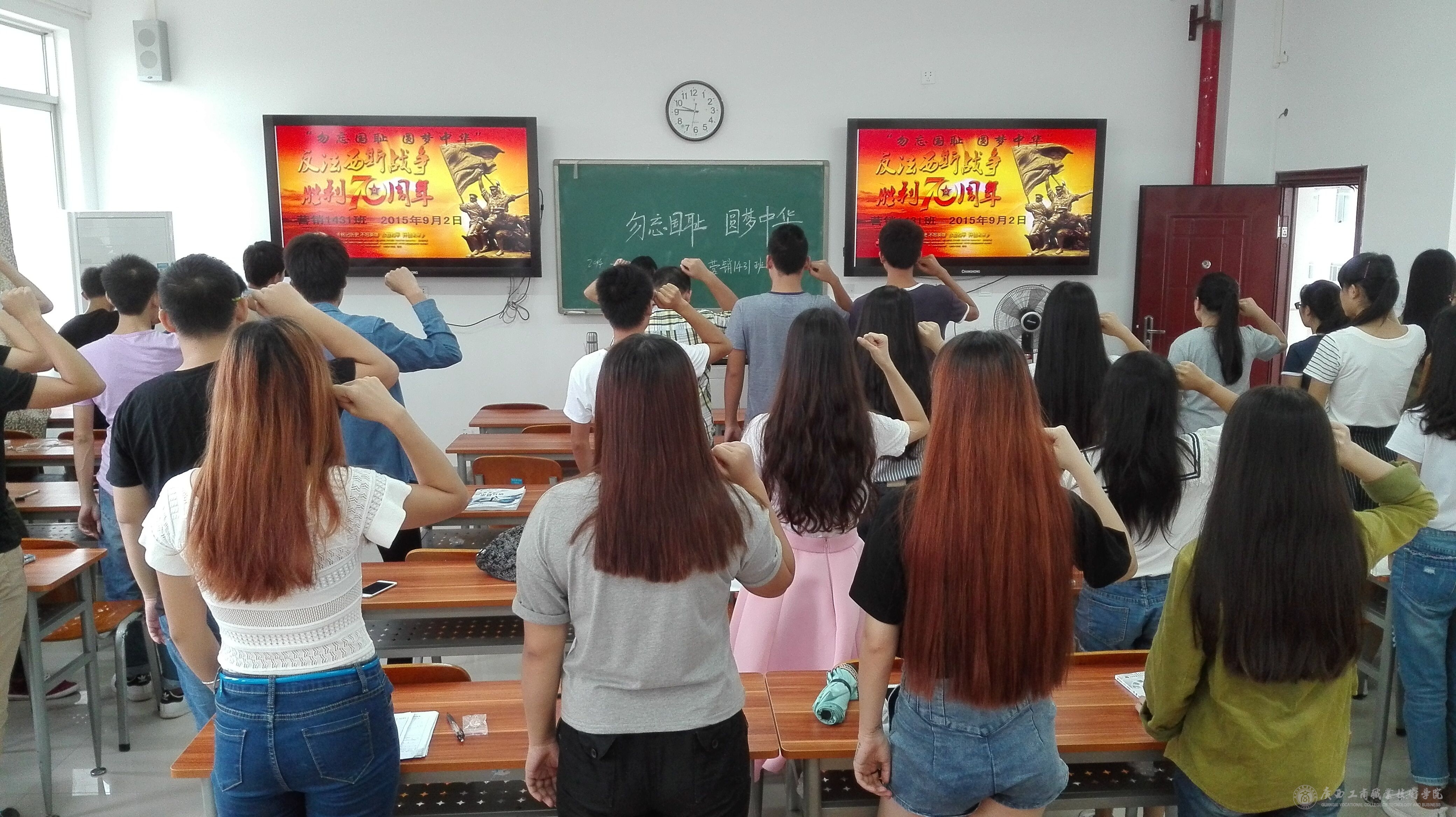 各班掀起開展“勿忘國恥 圓夢中華”為主題的愛國主義主題班會。我系開展的主題班會形式多種多樣,有觀看影片、座談會、專題討論會等。諸如物流1432班通過研討的方式讓同學們思考和平年代的大學生該如何愛國;營銷1431班通過播放南京大屠殺的紀錄片、愛國宣誓、同學們上臺談感受的方式提醒同學們勿忘國恥,珍惜當下,努力學習。酒店1431班則通過觀看影片、全體同學愛國主義大討論的方式重溫那段可歌可泣的歷史,緬懷先烈的英雄事跡。